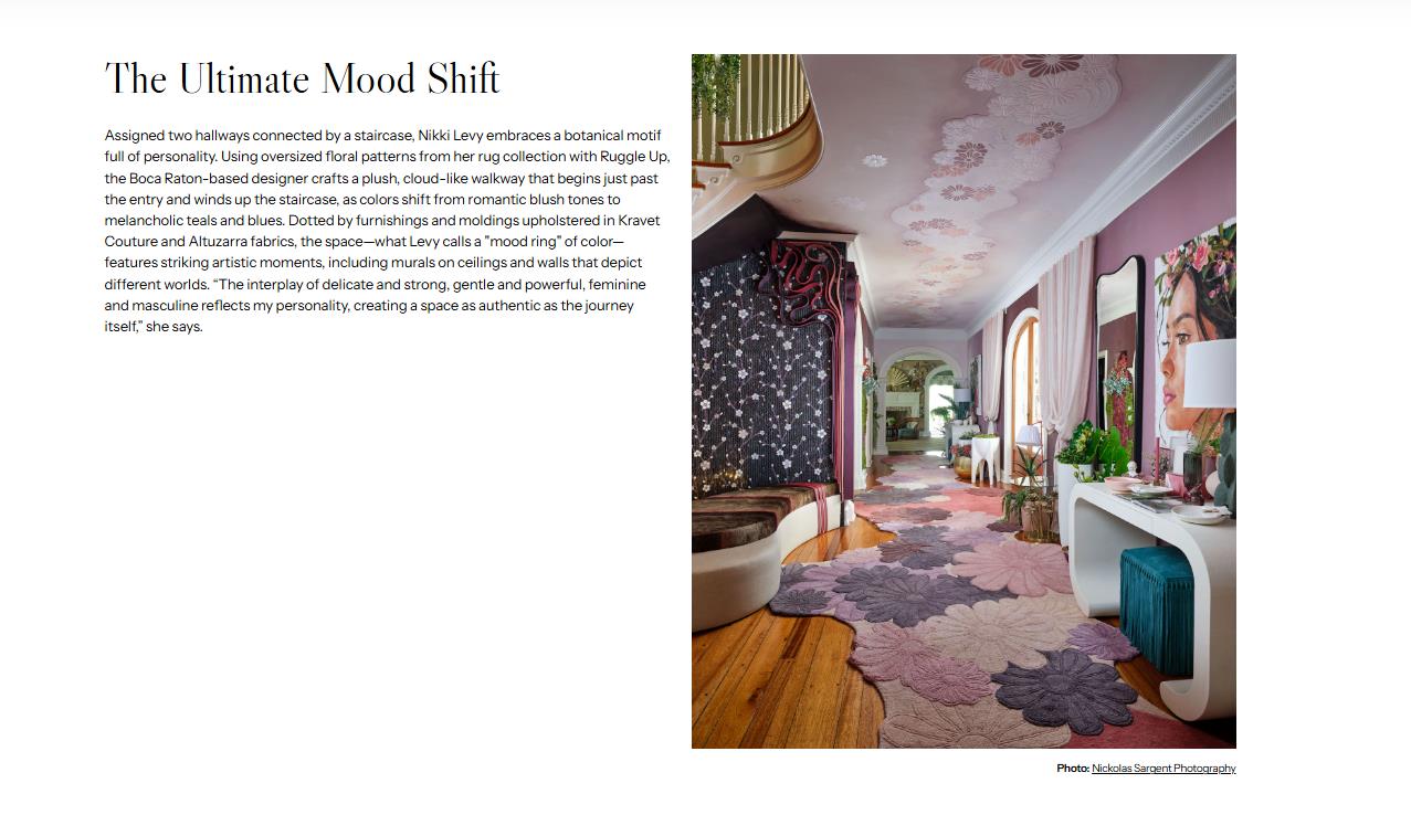 Assigned two hallways connected by a staircase, Nikki Levy embraces a botanical motif full of personality. Using oversized floral patterns from her rug collection with Ruggle Up, the Boca Raton-based designer crafts a plush, cloud-like walkway that begins just past the entry and winds up the staircase, as colors shift from romantic blush tones to melancholic teals and blues. Dotted by furnishings and moldings upholstered in Kravet Couture and Altuzarra fabrics, the space—what Levy calls a “mood ring” of color—features striking artistic moments, including murals on ceilings and walls that depict different worlds. “The interplay of delicate and strong, gentle and powerful, feminine and masculine reflects my personality, creating a space as authentic as the journey itself,” she says.