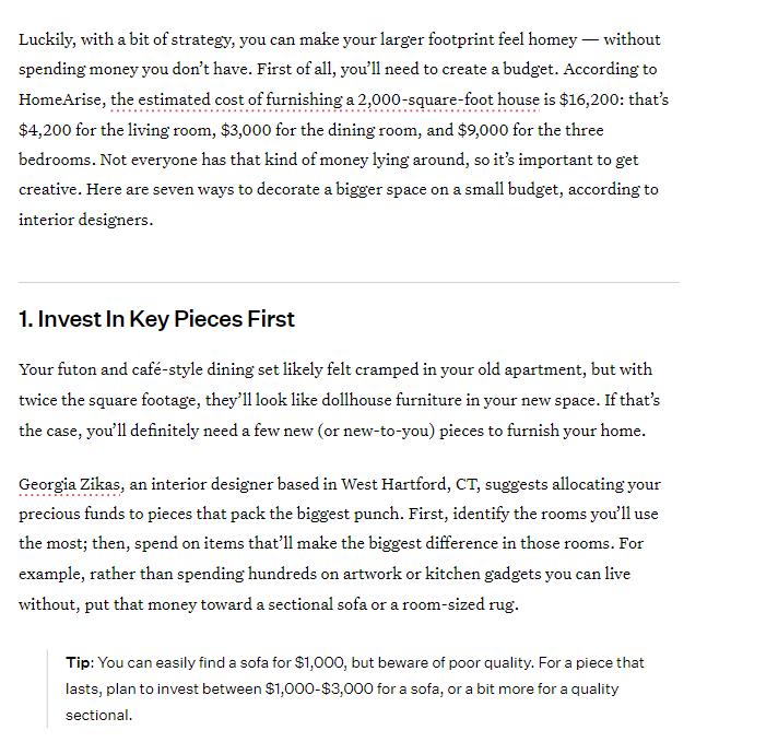 As much as you want everything to feel cozy and put together the minute you move, making a new space feel like home doesn’t happen overnight — especially if you’ve recently upgraded from a tiny apartment to a more spacious house. For one thing, you’ve probably never had so much space for furniture and decor. But there’s another challenge: While establishing roots in a long-term home may come with a new zest for decorating, money can be extra tight after a big move.