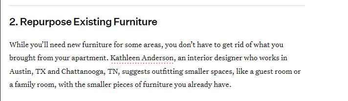 While you’ll need new furniture for some areas, you don’t have to get rid of what you brought from your apartment. Kathleen Anderson, an interior designer who works in Austin, TX and Chattanooga, TN, suggests outfitting smaller spaces, like a guest room or a family room, with the smaller pieces of furniture you already have.