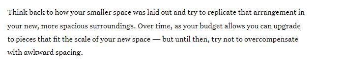 Think back to how your smaller space was laid out and try to replicate that arrangement in your new, more spacious surroundings. Over time, as your budget allows you can upgrade to pieces that fit the scale of your new space — but until then, try not to overcompensate with awkward spacing.
