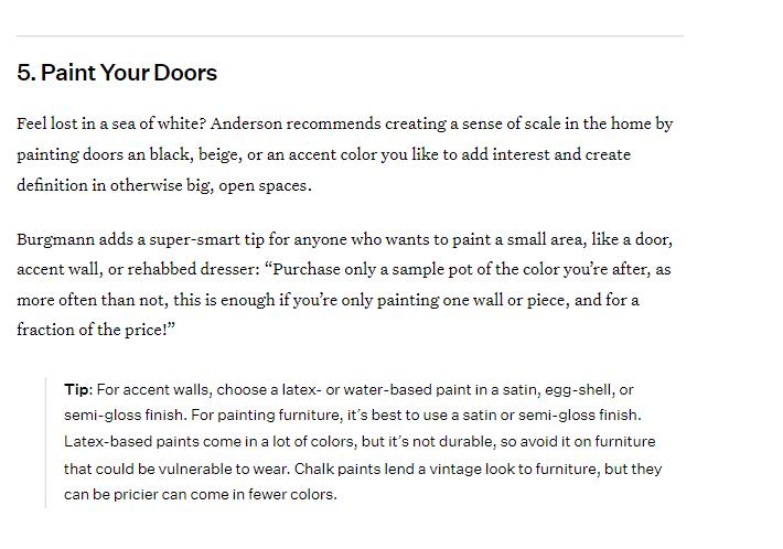 Feel lost in a sea of white? Anderson recommends creating a sense of scale in the home by painting doors an black, beige, or an accent color you like to add interest and create definition in otherwise big, open spaces.