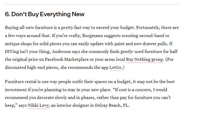 Buying all-new furniture is a pretty fast way to exceed your budget. Fortunately, there are a few ways around that. If you’re crafty, Burgmann suggests scouting second-hand or antique shops for solid pieces you can easily update with paint and new drawer pulls. If DIYing isn’t your thing, Anderson says she commonly finds gently-used furniture for half the original price on Facebook Marketplace or your areas local Buy Nothing group. (For discounted high-end pieces, she recommends the app LetGo.)