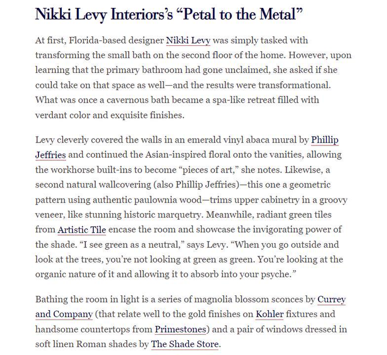 At first, Florida-based designer Nikki Levy was simply tasked with transforming the small bath on the second floor of the home. However, upon learning that the primary bathroom had gone unclaimed, she asked if she could take on that space as well—and the results were transformational. What was once a cavernous bath became a spa-like retreat filled with verdant color and exquisite finishes.