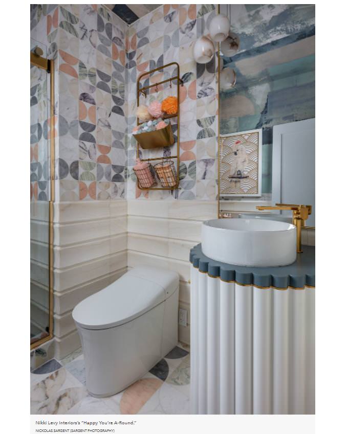 For the small second-floor bathroom, Nikki Levy focused on balancing heavy materials with soft curves and scalloped details. The fluted vanity topped with Silestone Cala Blue quartz from Cosentino perfectly embodies this harmony between masculine and feminine. Levy notes the circle and half-moon motifs seen in the tiles (Artistic Tile) and the painterly