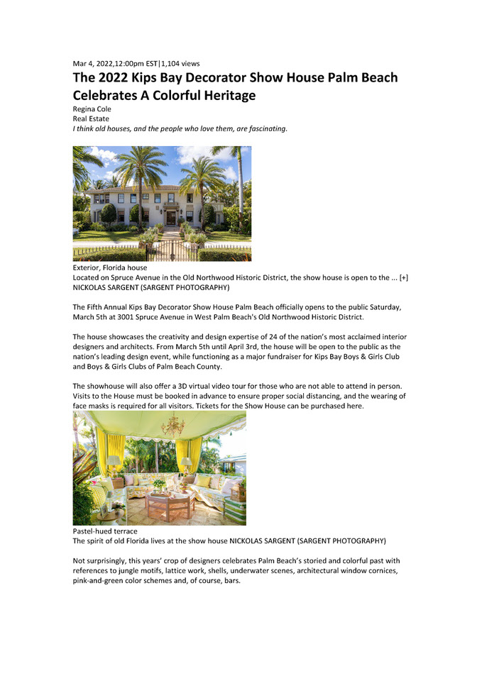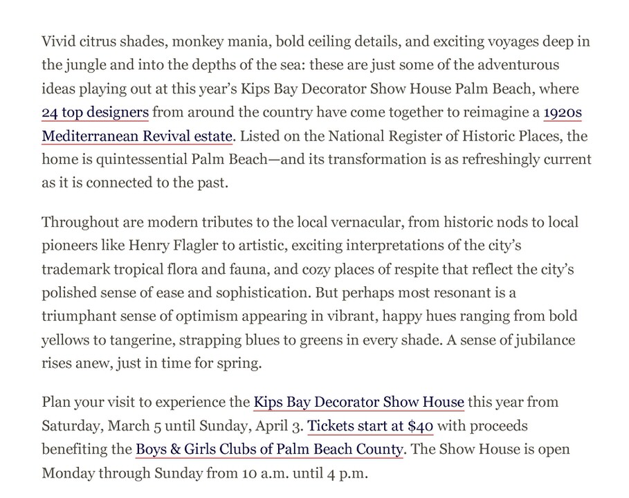 Plan your visit to experience the Kips Bay Decorator Show House this year from Saturday, March 5 until Sunday, April 3. Tickets start at $40 with proceeds benefiting the Boys & Girls Clubs of Palm Beach County. The Show House is open Monday through Sunday from 10 a.m. until 4 p.m.