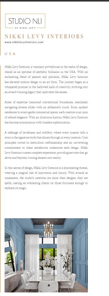 In the canvas of design, Nikki Levy Interiors is a shimmering thread of weaving a magical tale of innovation and luxury. With awards as ornaments, the studio’s creations are more than designs; they are spells, casting an everlasting charm on those fortunate enough to embrace its magic.”