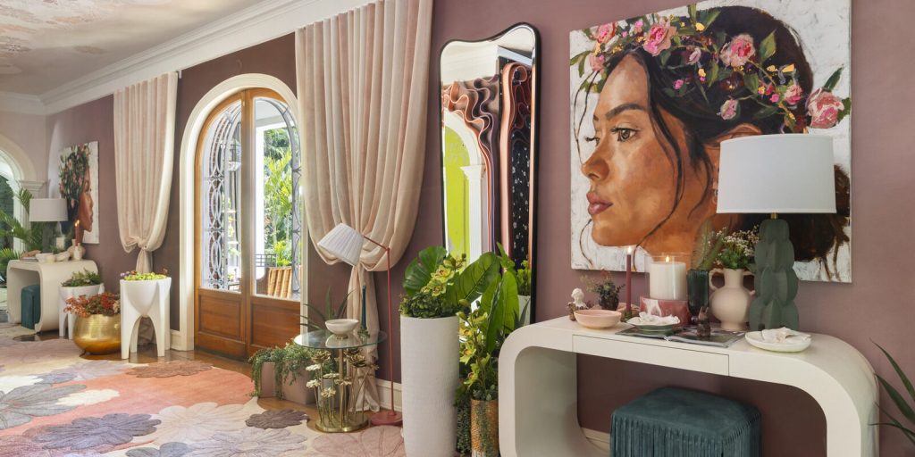 - Neutral and bold – Taupe linen paired with a vibrant fuchsia artwork draws the eye and conversation.