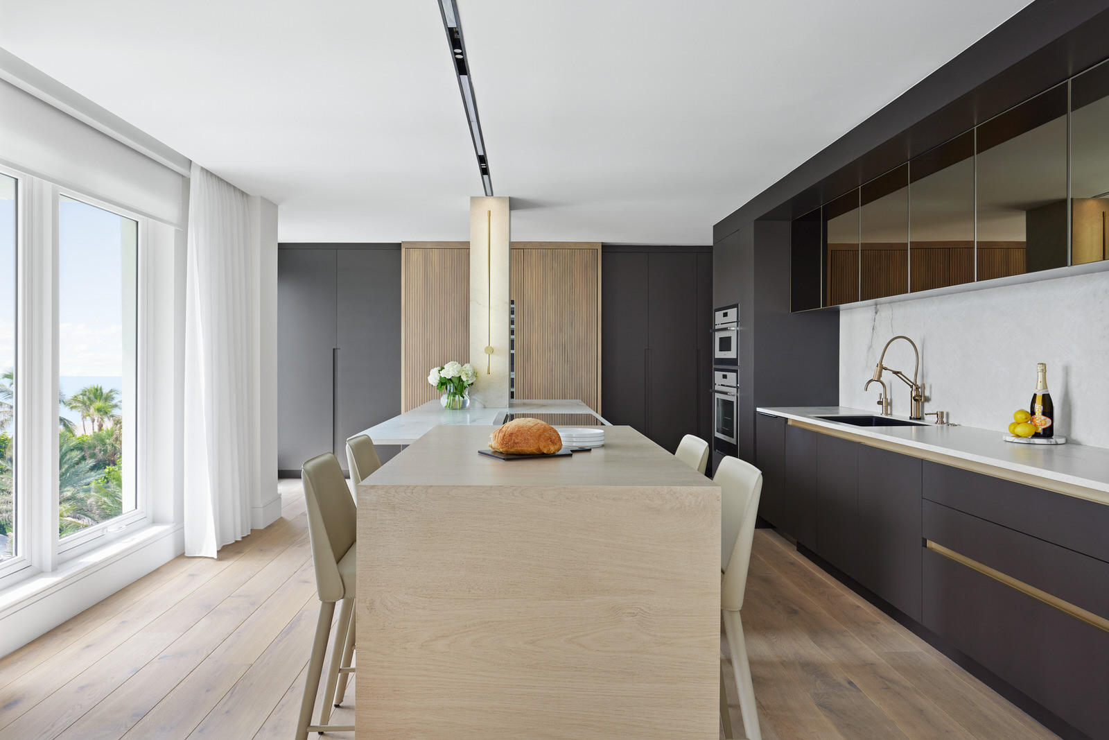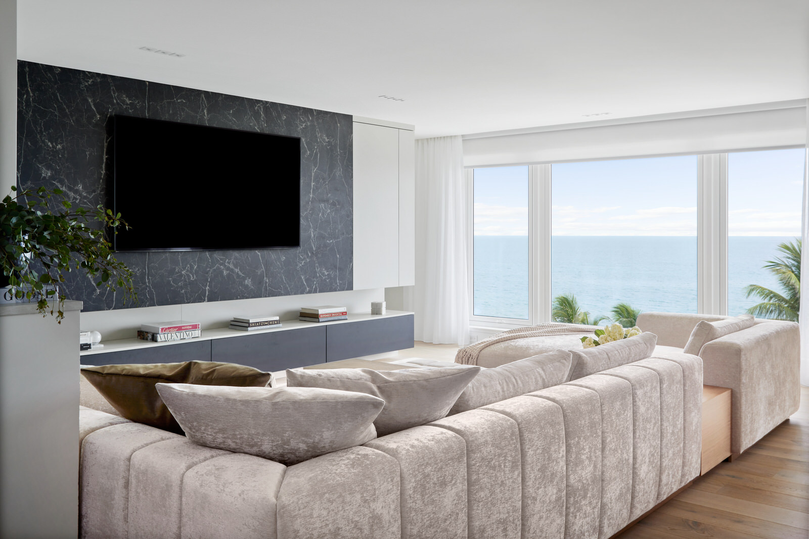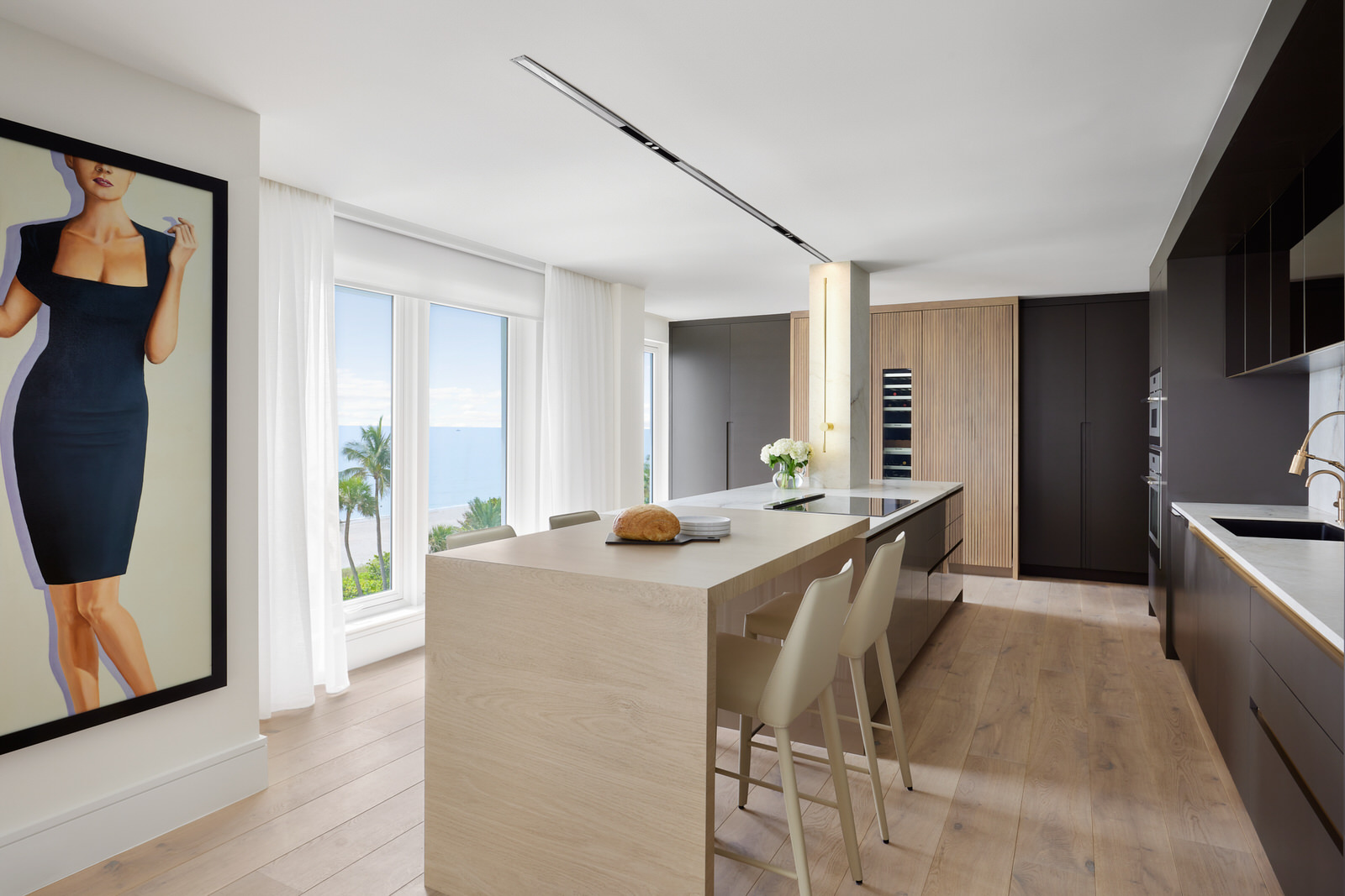 This beachfront condo has undergone a stunning total renovation, creating a contemporary sanctuary of elegance and comfort. Pristine white oak floors set a refined tone throughout, while bespoke millwork adds sophistication with built-in shelving and cabinetry.