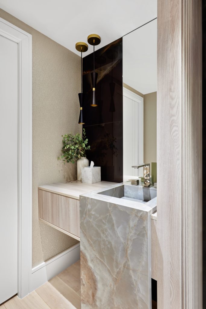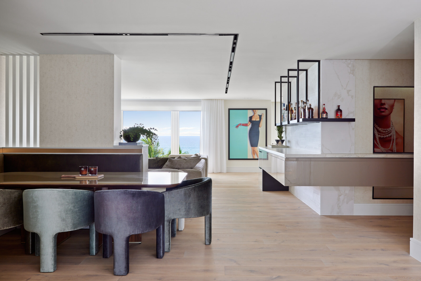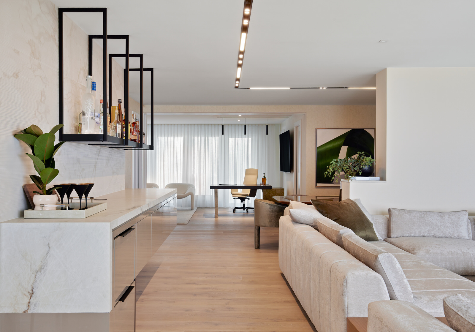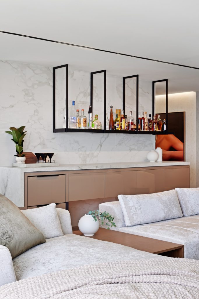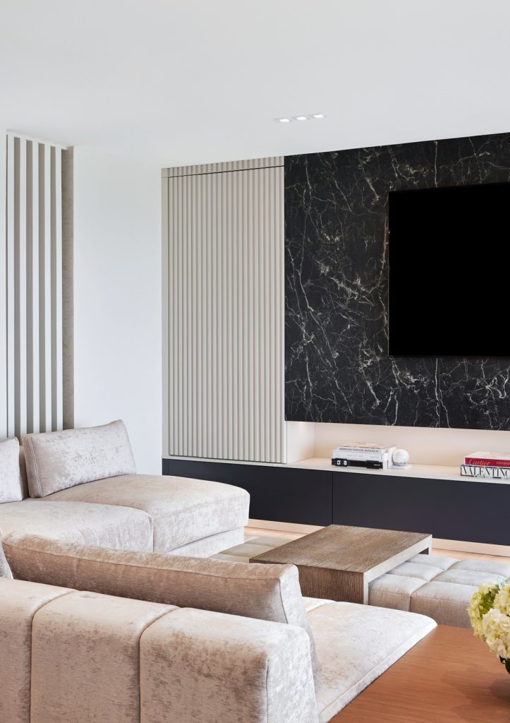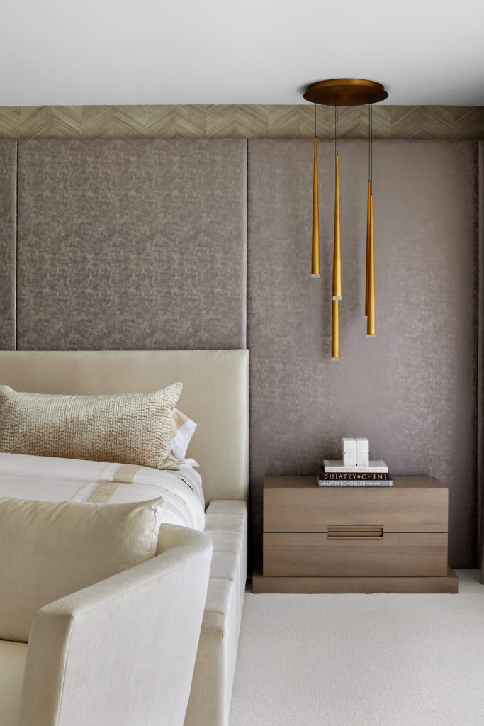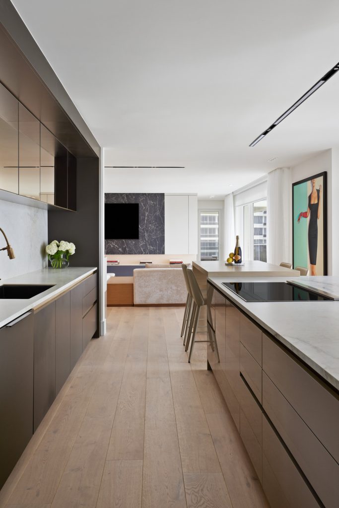 Luxurious fabrics enhance the aesthetic, providing a harmonious flow between rooms. The condo features clever multipurpose spaces, like a den that transforms into a guest room, ensuring versatility without compromising style
