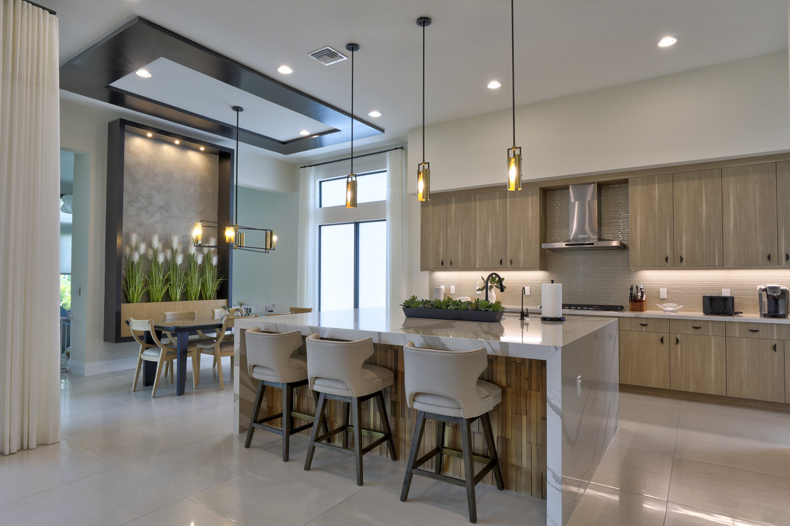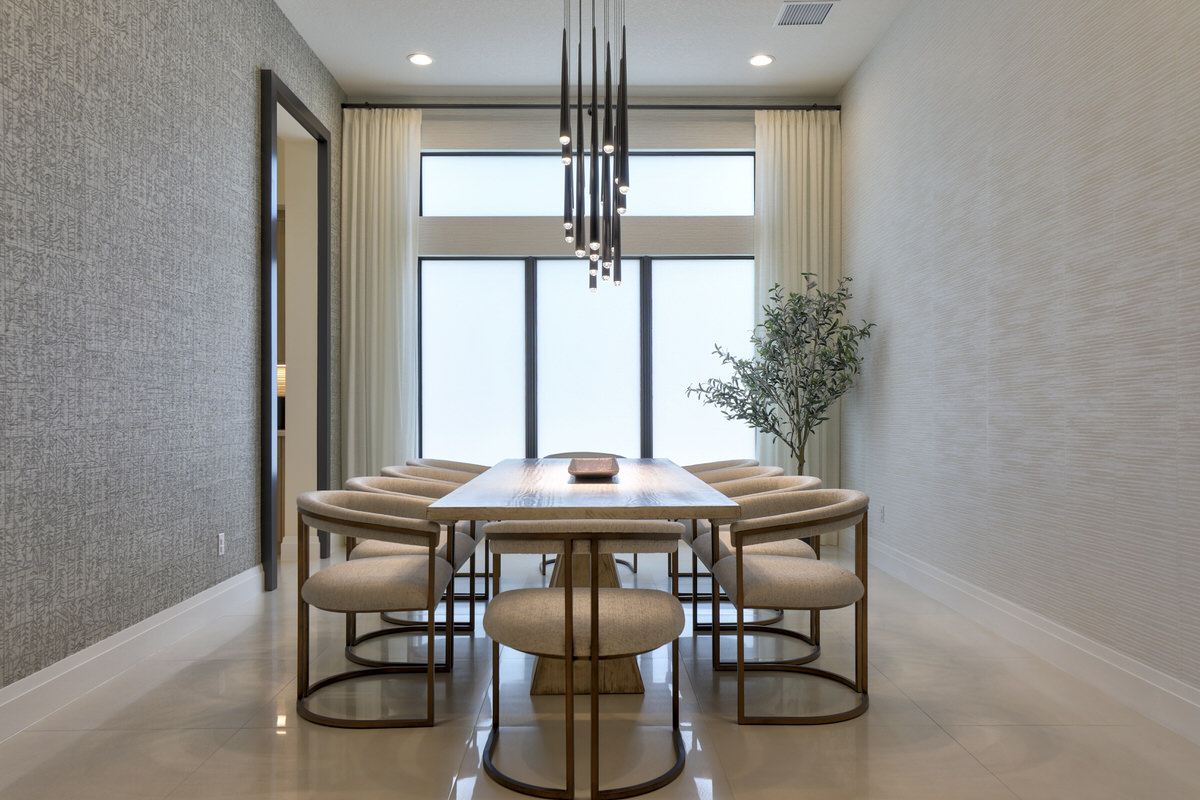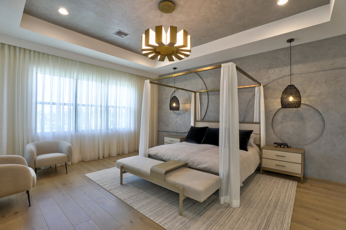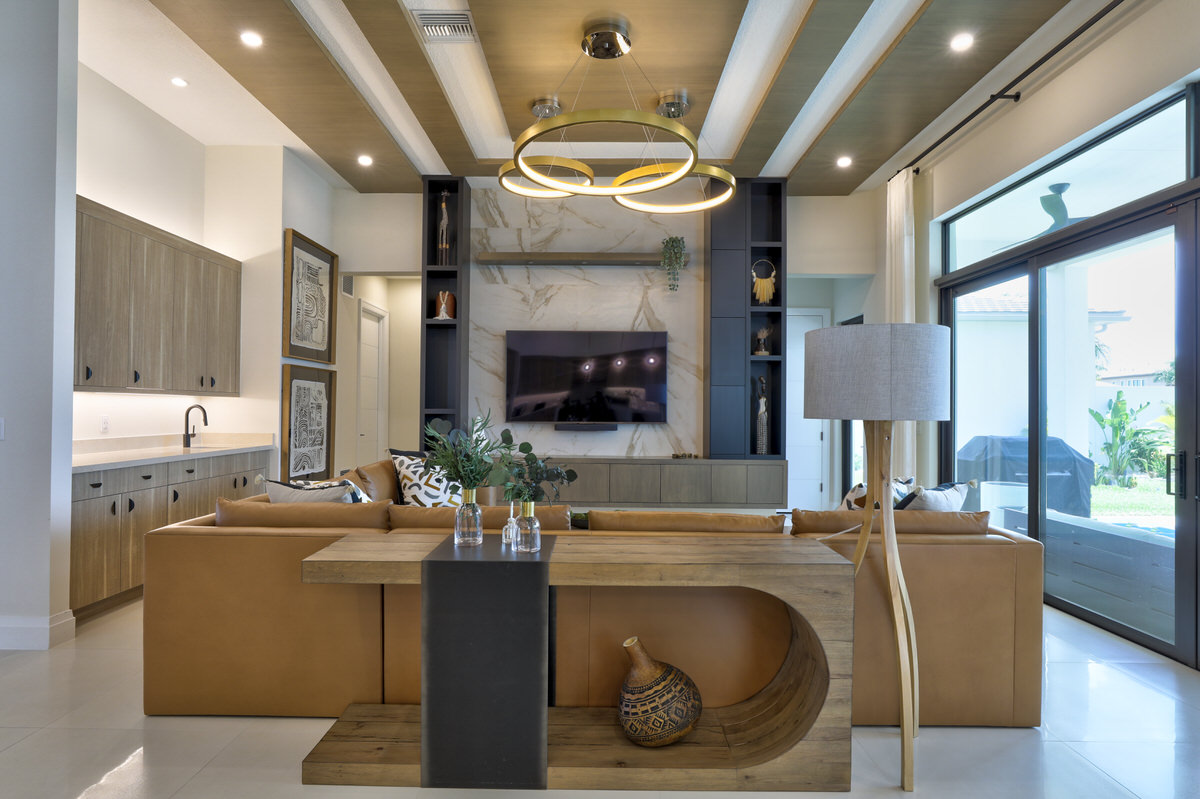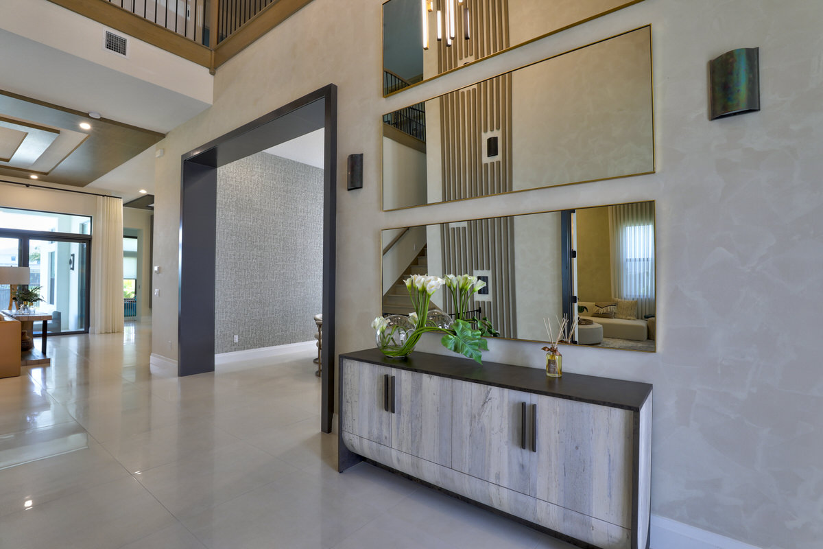 This is not your West Palm Beach-style home. The design of this space is conceptualized from the world beyond Florida, beyond the cookie cutter designs that have been such a staple of the area. Texture and tones are the tools that were abundantly called upon to create the artistry of this home. Elevated finishes, leaning into the moody and drama of each space are at once eye-catching and calming. Every space evokes adventure. The visual elements mesh beautifully with the sense of touch and sound. Water cascading, soft leathers, linear wood panels, textured wallpapers, and incredibly artistic paint finishes are all hallmarks of this contemporary lush design.