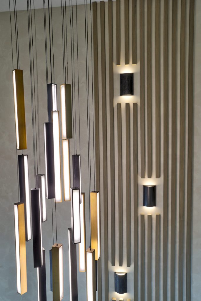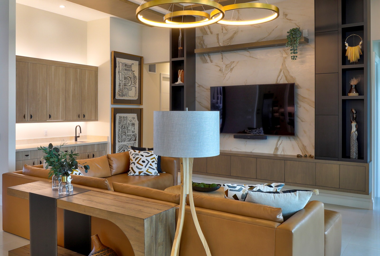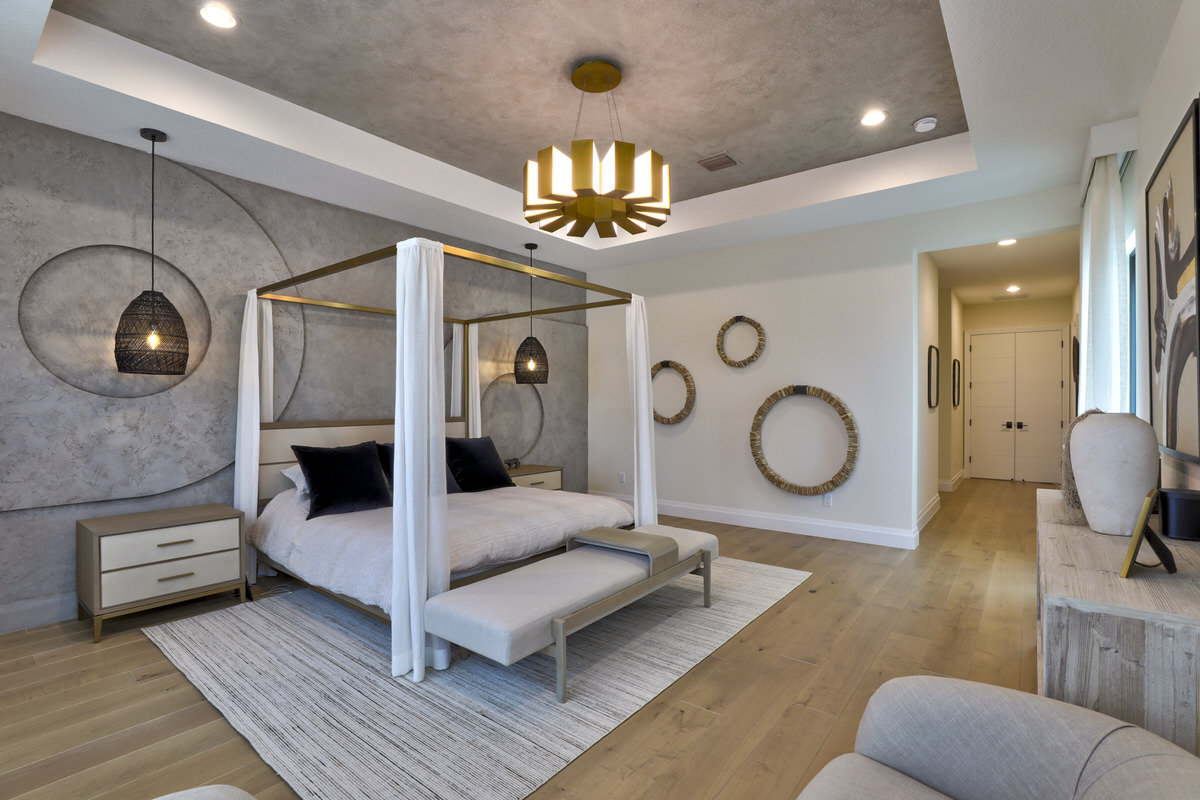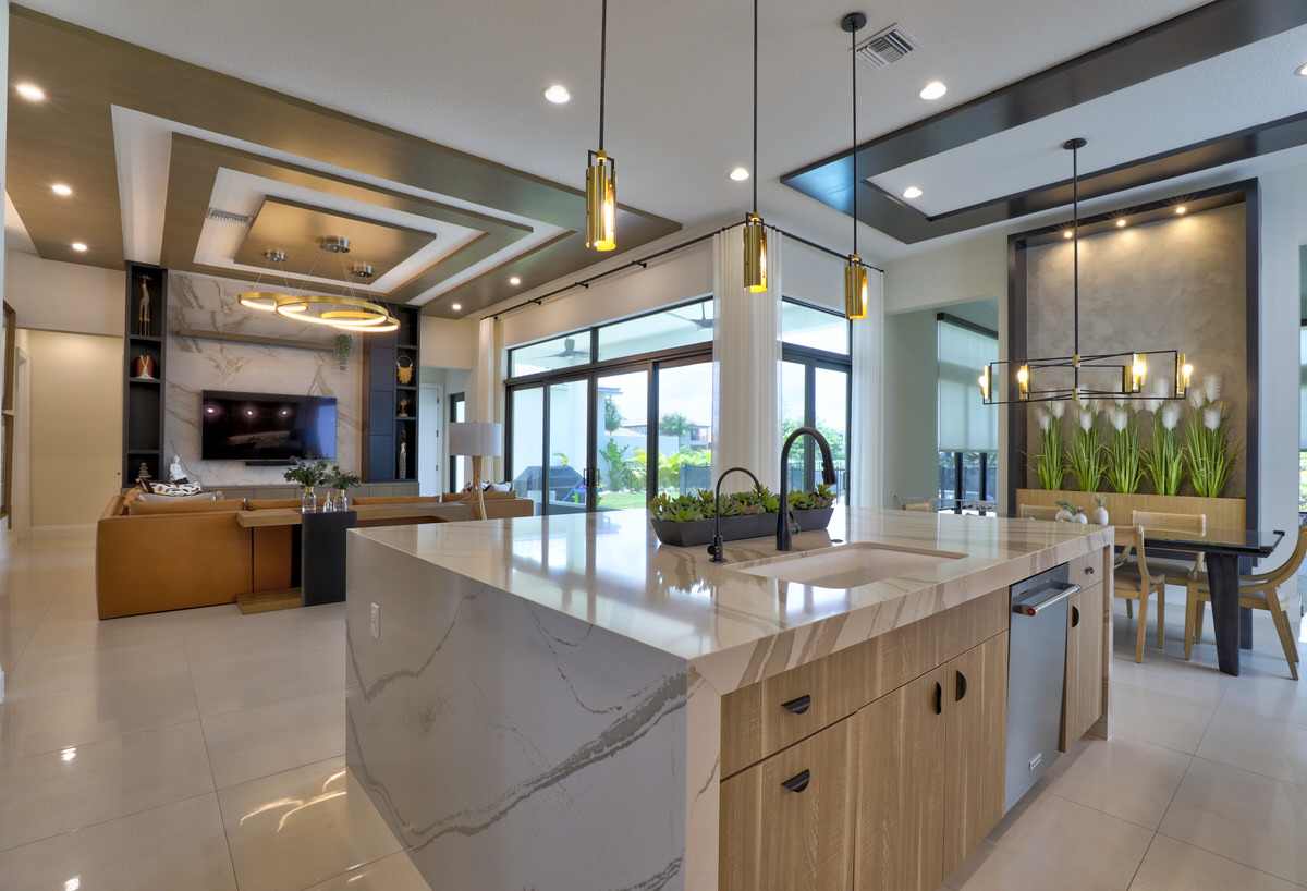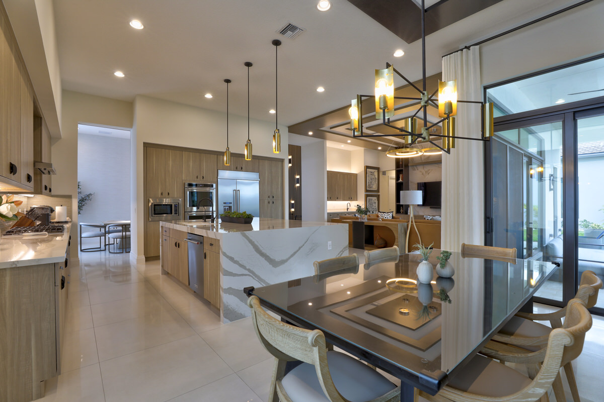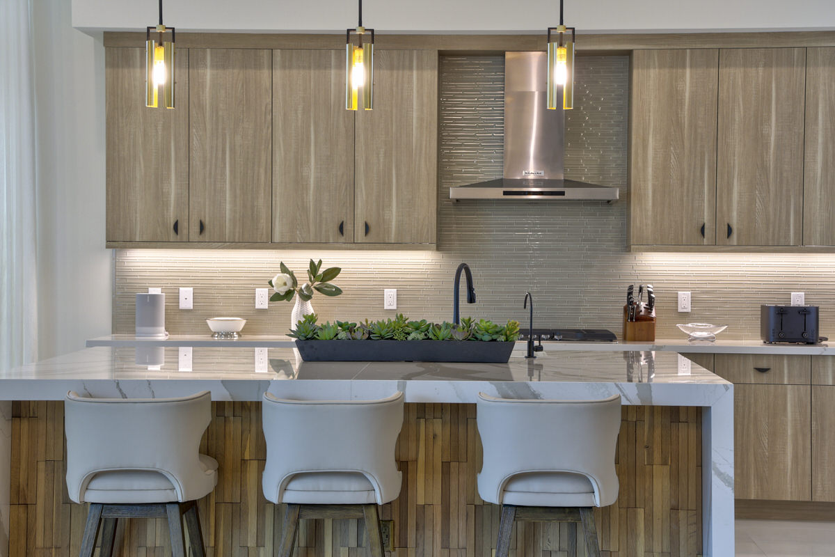 This is not your West Palm Beach-style home. The design of this space is conceptualized from the world beyond Florida, beyond the cookie cutter designs that have been such a staple of the area. Texture and tones are the tools that were abundantly called upon to create the artistry of this home. Elevated finishes, leaning into the moody and drama of each space are at once eye-catching and calming. Every space evokes adventure. The visual elements mesh beautifully with the sense of touch and sound. Water cascading, soft leathers, linear wood panels, textured wallpapers, and incredibly artistic paint finishes are all hallmarks of this contemporary lush design.