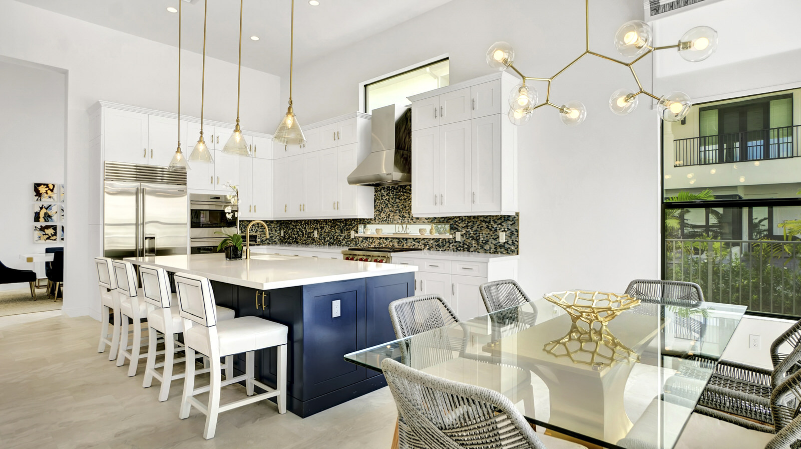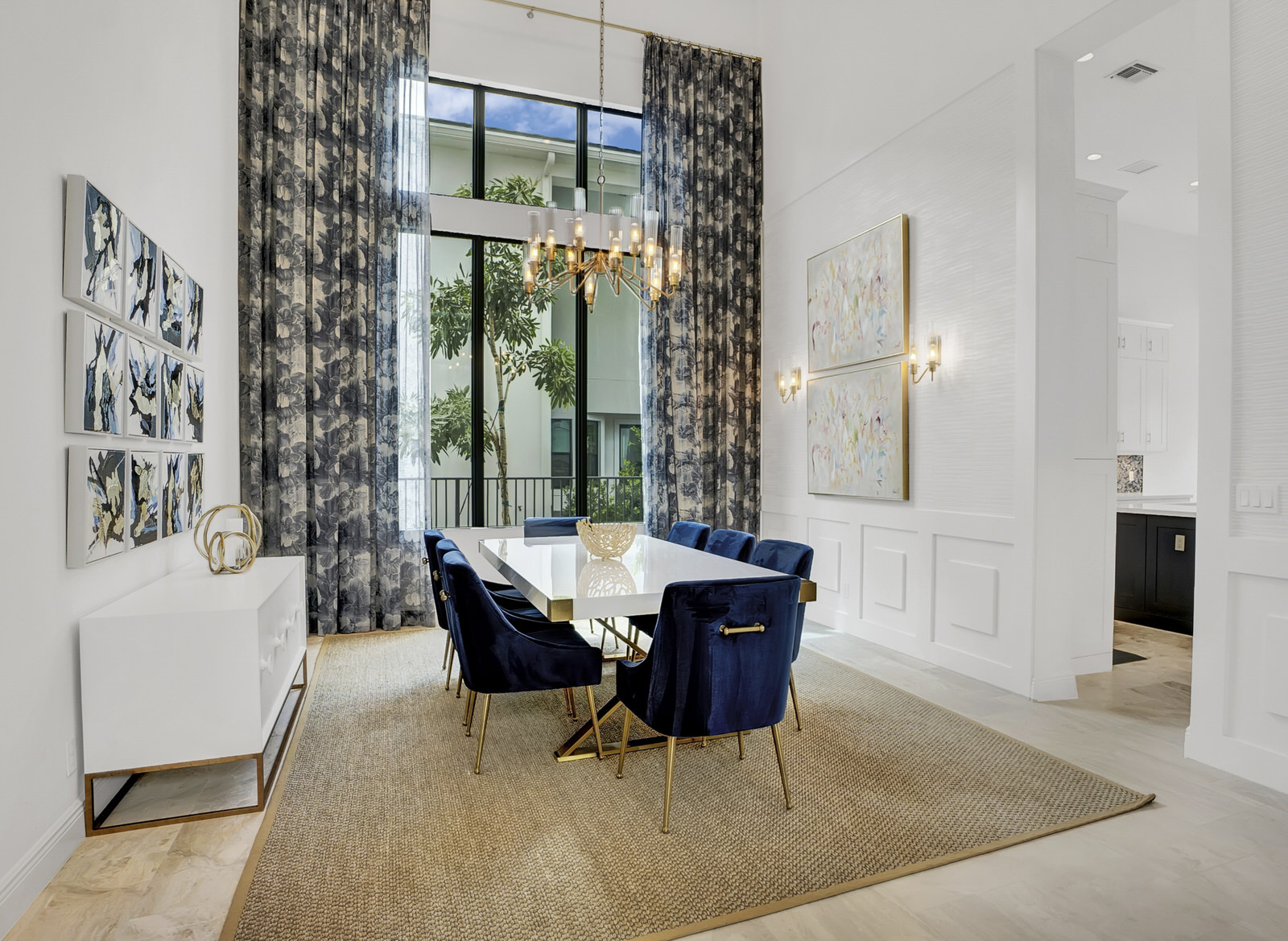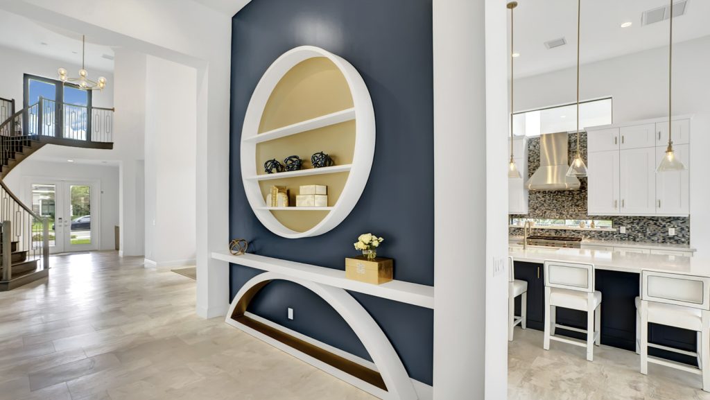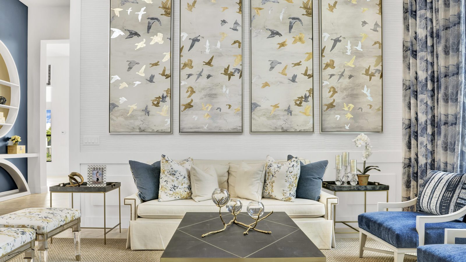 This Boca Raton community is filled with beautiful homes, all lined with emerald green grass and towering palm trees, the perfect backdrop for this truly magical home. It is hard not to take note of the quiet joy that vibrates throughout this house, with its deep blues, golds, yellows and whites all culminating seamlessly. The luxe fabrics, wallpapers, custom cabinetry and natural materials are present yet not overwhelming and the open plan design is brought to its full potential with the tightly woven interior design.